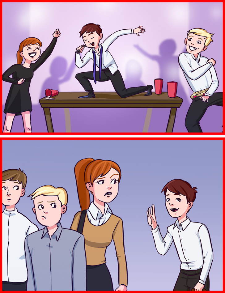 При этом, конечно же, не стоит слишком расслабляться. Помните, что вокруг вас не друзья детства, а коллеги, не злоупотребляйте алкоголем и не слишком откровенничайте на личные темы. Вряд ли вам будет комфортно в офисе, где все знают о тонкостях ваших проблем с бывшим и видели вас отплясывающей на столе. Вспомните пункт № 1.