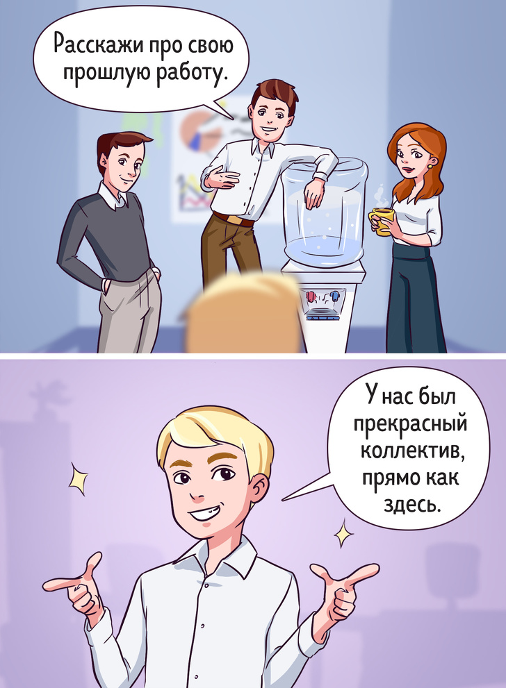 Если на вашем предыдущем месте работы или учебы было так круто, то почему вы сейчас здесь? Если же вы, наоборот, негативно отзываетесь о предыдущем коллективе, то где гарантия, что точно так же вы впоследствии не оцените нынешний? Кроме того, не исключено, что, рассказывая подробности о предыдущем месте работы, вы случайно не разгласите коммерческую тайну, а это уже чревато уголовным преследованием.